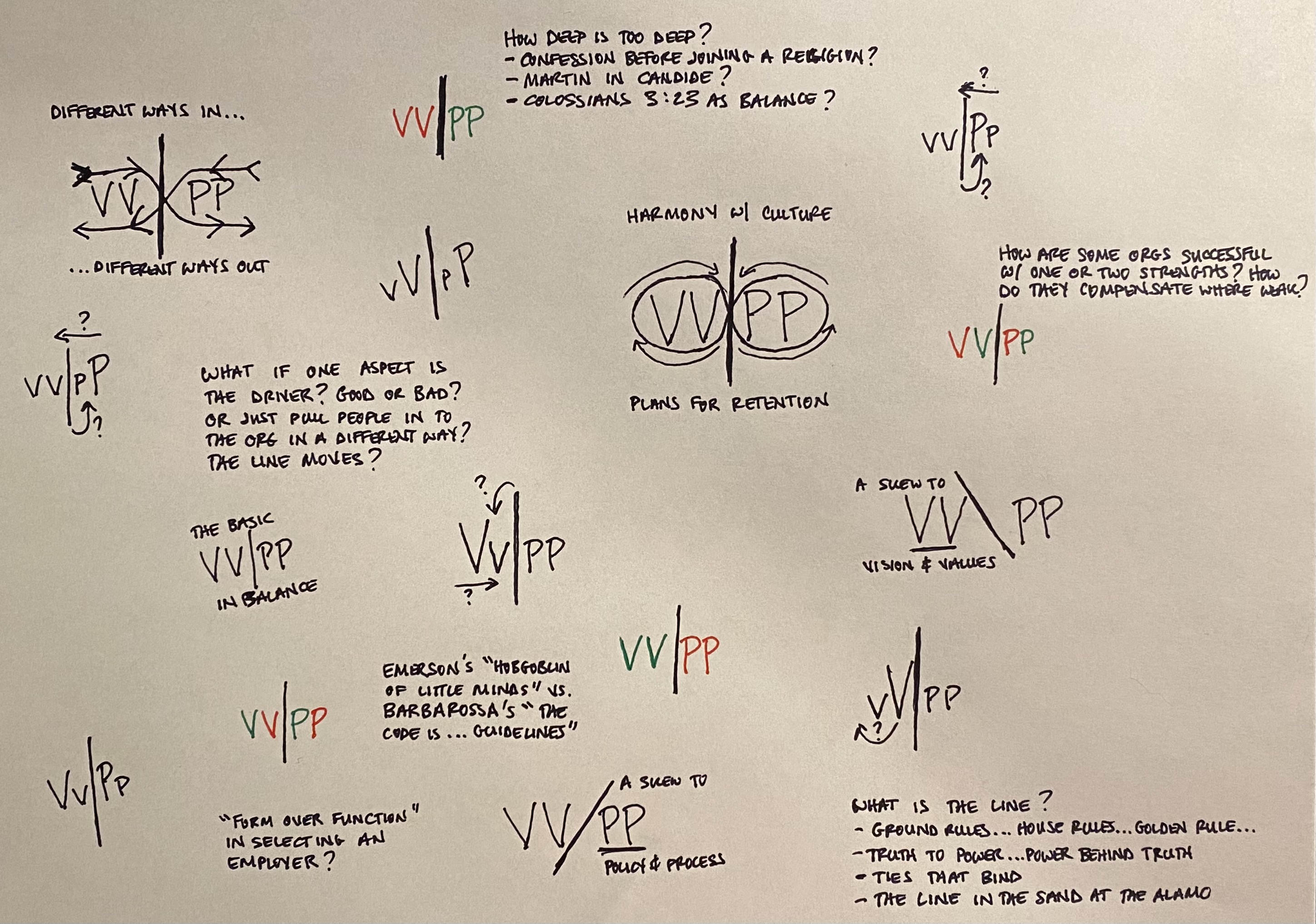 The Line is not culture. I see Culture as the system – implicit and explicit, formal and informal – that ties VV and PP together. Without defining The Line, Culture cannot come to life. It’s like a house divided. An organization cannot stand on Vision and Values alone without being able to execute via Policy and Process. Nor can Policy and Process dominate to the point where it’s not clear what the organization stands for via it’s Vision and Values. Culture has to allow for these things to be in harmony.