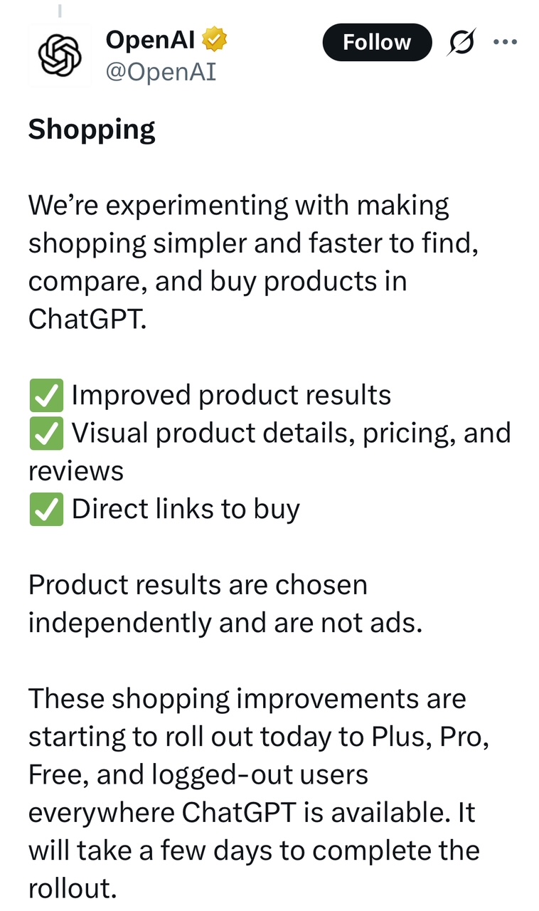 Third, it seems pretty obvious where “direct links to buy” will take the AI business model, even if they say they are “not ads” – yet. I’m going to be lazy here and not look it up, but Google’s purpose or vision or insert word(s) here for the most important thing they ever wanted to do or be was to make all information available to everybody everywhere all the time – or something like that. They built one heck of an ad model from that high-fallutin’ purpose.